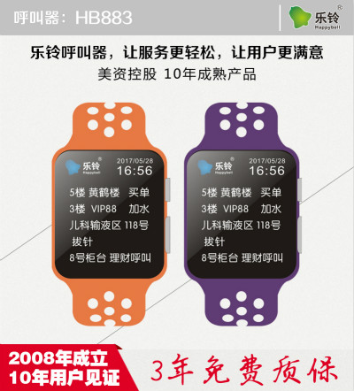 乐铃无线呼叫器,让服务更轻松,让用户更满意。HB883移动腕表主机,双语操作系统,支持任何语言定制,可以免费定制中文房号,包房名称,呼叫服务内容等。支持方案开发定制。自动组网,技术先进,无需设置。乐铃无线呼叫器,机型众多,功能完善,有一体机,分体机,LED显示屏主机,数码管显示屏主机,各类型腕表呼叫器,支持小批量定制,大量出货,时间周期短,品质好。支持OEM,ODM等,中文主机支持中文房号显示+语音报号+配电脑呼叫管理软件+手机客户端,提供API数据输出,上位机对接等功能,支持大型工厂项目,工程项目定制化需求,我们有专业的技术研发队伍提供技术对接,开发支持。