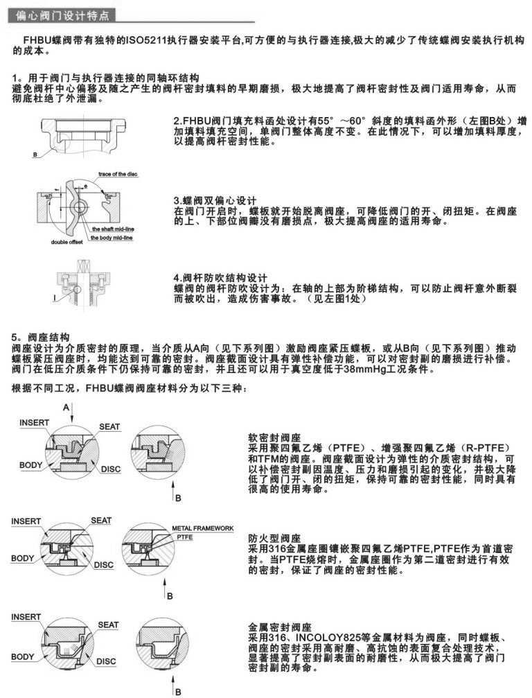 高性能蝶阀特点 采用带有球形密封表面的双偏心蝶板,配以单片挠性唇式密封座,适用于要求可靠密封和良好调节特性的场合。由于双偏心蝶板的设计,该阀门具有严密的密封性能,超长的使用寿命。可作快速切断或调节流量之用。产品适用于各种工业管道中液体和气体(包括蒸汽)的输送。经特选,也可用于特殊介质,如氯气、氧气、高真空、抗硫或腐蚀性介质。产品还可具有防火结构供选择。连接方式可采用对夹式或用于大管径及管路经终端的凸耳式单法兰设计。 高性能蝶阀其主要特点如下: 1、开启力矩小,灵活方便,省力节能。 高性能蝶阀采用标准 设计标准 :GB/T12238-1989;JB/T8527-1997 美标设计制造:API609、MSS SP-67、MSS SP-68 检验和试验:API598 法兰连接:ASME B16.5(NPS≤24)、ASME B16.47 B系列 对焊端:ASME B16.25 结构长度:API609 温压等级:ASME B16.34 蝶阀是用圆形蝶板作启闭件并随阀杆转动来开启、关闭和调节流体通道的一种阀门。蝶阀的蝶板安装于管道的直径方向。在蝶阀阀体圆柱形通道内,圆盘形蝶板绕着轴线旋转,旋转角度为0°~90°之间,旋转到90°时,阀门则牌全开状态。蝶阀又叫翻板阀,是一种结构简单的调节阀,同时也可用于低压管道介质的开关控制。蝶阀(英文:butterflyvalve)是指关闭件(阀瓣或蝶板)为圆盘,围绕阀轴旋转来达到开启与关闭的一种阀,在管道上主要起切断和节流用。蝶阀启闭件是一个圆盘形的蝶板,在阀体内绕其自身的轴线旋转,从而达到启闭或调节的目的。蝶阀全开到全关通常是小于90°,蝶阀和蝶杆本身没有自锁能力,为了蝶板的定位,要在阀杆上加装蜗轮减速器。采用蜗轮减速器,不仅可以使蝶板具有自锁能力,使蝶板停止在任意位置上,还能改善阀门的操作性能。、工业专用蝶阀的特点能耐高温,适用压力范围也较高,阀门公称通径大,阀体采用碳钢制造,阀板的密封圈采用金属环代替橡胶环。大型高温蝶阀采用钢板焊接制造,主要用于高温介质的烟风道和煤气管道。 蝶阀阀门的优点