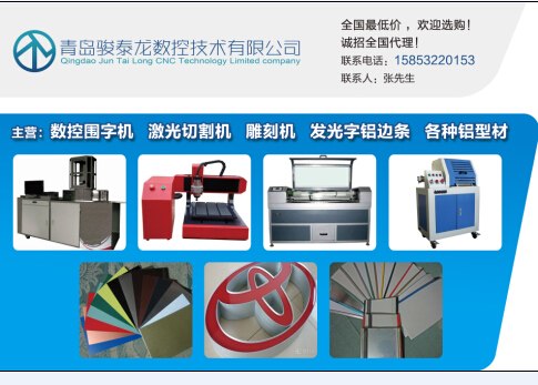 青岛骏泰龙数控技术有限公司,开发各种广告设备,开发的发光字铝边带等型材高档美观,数控围字机更是锦上添花,可以说是发光字的一次革命。效率质量大幅度的提高,节省了人工。本公司将以周到的服务,优质的质量,热诚欢迎标示界的朋友精诚合作。公司生产有,数控围字机,发光字边带开槽机,亚克力开槽机,铝边带型材机,各种发光字铝边带,有拉丝银,拉丝金,黑,红,白,铝本色,镜面,钛金等欢迎选购 公司总部位于美丽的海滨城市青岛,产品畅销全国各地,是同行中的佼佼者。公司本着以质量求生存,以信誉谋发展的经营理念,热忱欢迎各界朋友莅临指导和洽谈业务,共谋发展。