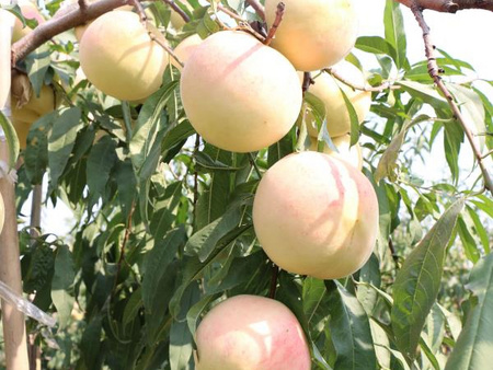 绿然10号:阳历10月上旬成熟,70%以上着鲜艳玫瑰红色,平均单果350克左右,对一般的桃蚜,桃螨,梨小食心虫以及真菌细菌性病害,抵抗能力强。同时桃香浓郁,放几个桃在房间,满屋都是桃香味,吃后口齿留香,含糖量18%以上,咬一口犹如富士苹果,脆甜冰爽。肉质细腻无渣,挂树30天不软,货架期很长,此桃丰产性能稳定,没有大、小年现象,果品均匀,整齐度高,注意幼树期树形的培养和控制,采取前促后控的方式,形成有效的成枝量为来年丰产打好基础。此桃上海,广州客户,需求量很大,非常畅销,近几年价格不断走高,是晚桃中极有潜力的品种