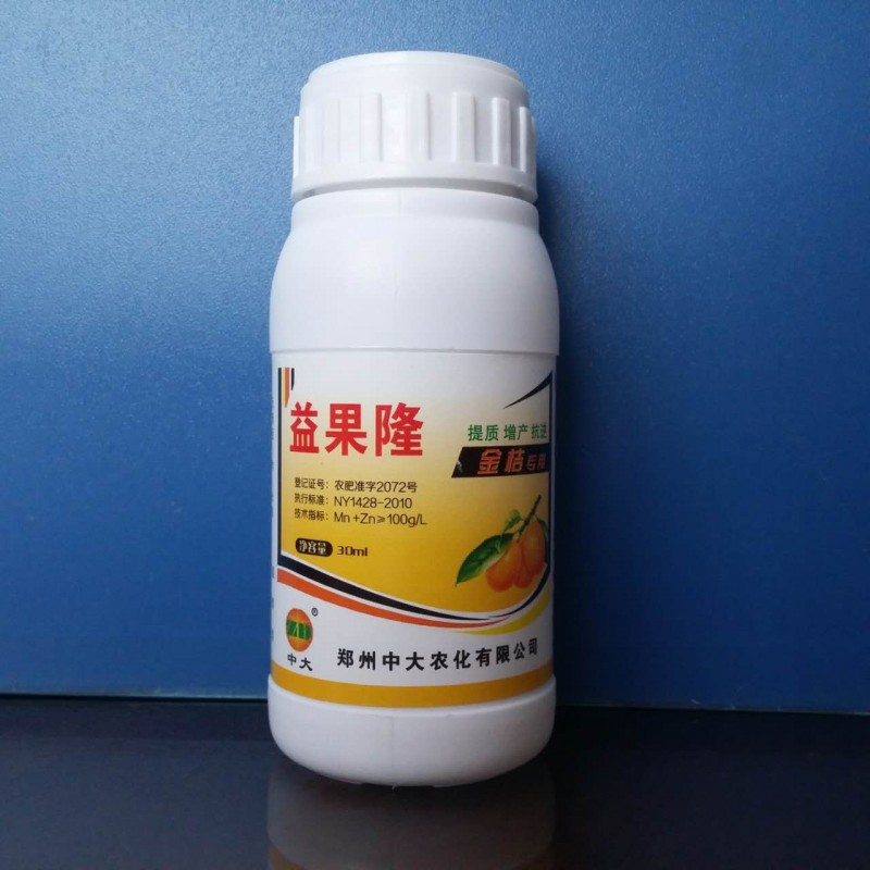 郑州中大农化有限公司主要致力于植物生长调节剂、水溶肥料、助剂、化工中间体等化学品开发研制高科技企业。 新型益果隆金桔专用 采用纯生物源经发酵萃取工艺,螯合锰、锌等营养精华,针对金桔生长发育的生理特性精制而成的早熟型营养调理剂。具有很强的细胞分裂活性,可诱导细胞分裂,促进愈伤组织形成,引发有关酶和蛋白质的合成,协调作物内源激素的分泌,诱导植物基因的表达,加快花器形成发育,促进花粉管伸长和花粉萌发,提高授粉率,并促进果实膨大,改善果型,增加产量,提高品质。