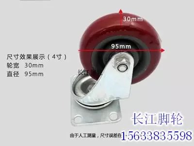 轮片直径:95mm轮宽:30mm安装高度:132mm底板尺寸:95*67mm安装孔距:74*45 mm安装孔直径:8.0毫米单轮承载:120公斤厂家提示;购买时请注意4个轮子承重只可以算3个轮子载重的总和,因为总有路面不平的时候,4个轮子受力不可能均匀的。载重放宽一点也有利于延长轮子的使用时间以下是脚轮知识及买家注意事项脚轮是个统称,包括活动和固定脚轮。活动脚轮也就我们所说的万向轮,它的结构允许360度旋转;固定脚轮没有旋转结构,不能转动。通常是两种脚轮一般都是搭配用的,比如手推车的结构是前边两个固定轮,后边靠近推动扶手的是两个活动万向轮。