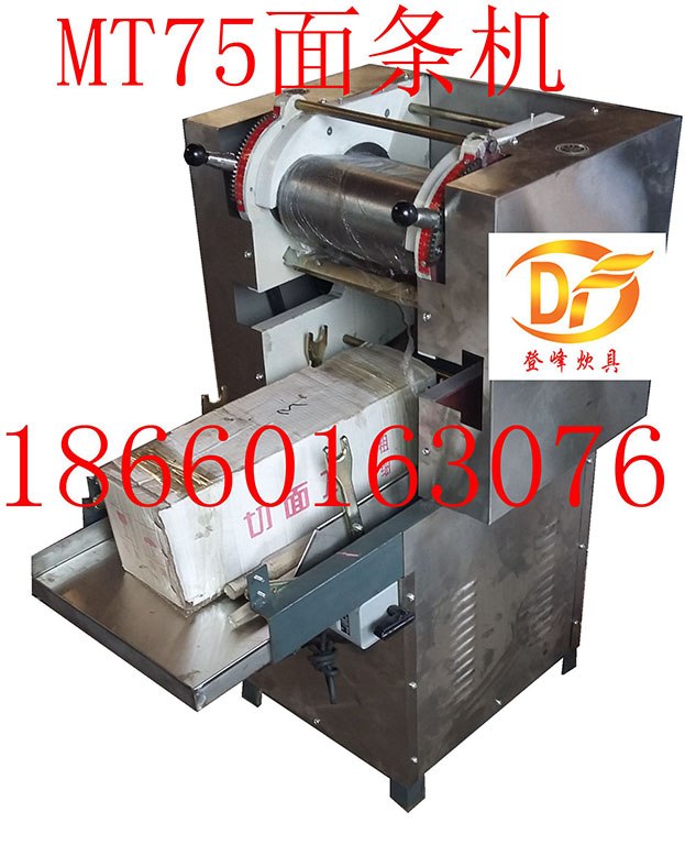 3、 操作:把拌好的面料放入面斗内,按刀并固定刀板(或挂钩)就可开机运转,第三组下来的面用手引导下一组,多组一次类推。