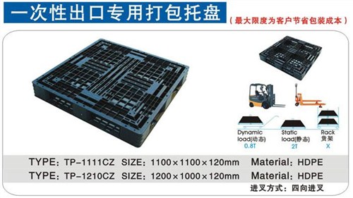 无锡海颂公司通过ROHS体系认证,出口免熏蒸。 无锡海颂塑业有限公司是物流塑料包装方案的专业供应商,产品包括:塑料托盘、塑胶栈板、塑料物流箱、EU欧标箱,塑料箱筐、塑料垃圾桶、塑料零件盒,EPE,EVA缓冲包装材料,吸塑制品等塑料制品,已形成了研究开发、代加工制造、产品储运、售后服务等完整产业链。海颂形成了出口&周转塑料托盘,物流周转用箱和缓冲包装材料三大产品系列。 托盘具体型号有:网格塑料托盘,平板塑料托盘,九脚塑料托盘,田字塑料托盘,川字塑料托盘,单面九脚托盘,平板九脚托盘,网格川字货架托盘,平板川字货架托盘,平板田字托盘,网格双面托盘,平板双面托盘 。此款为平板九脚单面塑料托盘,尺寸1100*1100*120mm,颜色黑色,用于企业工厂出口欧美日韩,一次性使用不回收,降低包装成本。物流公司出货也使用平凡。具体规格有1200×1000,1200×800,1200×900,1100×1100,1300×1100,1200×1200,1200×1100,1100×900,1000×1000,1000×800,1100×1000高度均为150mm,动载1吨,静载4吨。 另外有厚款网格田字塑料托盘选购,适合载重要求不高的厂家,规格齐全,欢迎选购。
