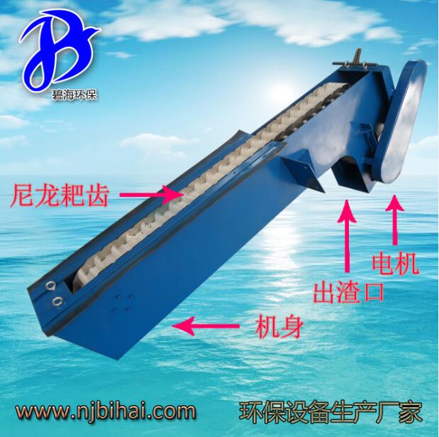 该设备是由ABS 工程塑料、尼龙或不锈钢制成的特殊形耙齿,按一定的排列次序装在耙齿轴上形成封闭式耙齿链,其下部装在进水渠水中。当传动系统带动链轮作匀速定向旋转时,整个耙齿链便自上而下运动,并携带固体杂物从液体中分离出来,流体通过耙齿间隙流出去,整个工作状态连续进行。由于耙齿的特殊结构形状,使耙齿链携带杂物到达上端反向运动时,前后耙间产生相对自清运动,促使杂物依靠重力脱落,设备后面可设置旋转的清污刷,进一步除净滞留在耙齿污物,如需要定货时需注明。