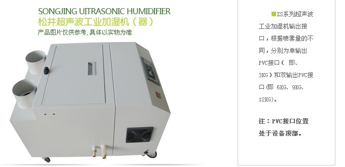 数字式湿度控制器自动控制,(型号后以字母“Z”表示 ),湿度控制器控制范围可由1%RH-99%RH任意设定,控制精度±5%RH,此时,设备可 在设定值内自动工作,无需人员职守。ZS系列超声波工业加湿机的输出管路,可按用户需要加湿的场所合理布置管线,均匀分布出雾口,管线间连接需密封。ZS系列超声波工 业加湿机,内部采用集成式雾化组件,并配有无水保护装置,所产生的雾粒直径只有1- 10μm,颗粒均匀,能长时间悬浮于空气当中。ZS系列超声波工业加湿机,雾化工作时 无机械驱动、无噪音干扰、无污染,雾化效率高、故障率低、能耗低,是高效、可靠、实用的超声波工业加湿设备。ZS系列超声波工业加湿机,配合Φ110mm PVC标准管路使用,广泛应用于下列各行业中: 1、纺织行业 2、造纸行业 3、计算机房 4、电子行业 5、喷涂行业 6、塑料行业 7、火药行业 8、印刷行业 9、实 验 室10、烟草行业 11、暖通行业 12、保鲜储藏 13、食品行业 14、种 植 业 15、养 殖 业 16、人工景观 。