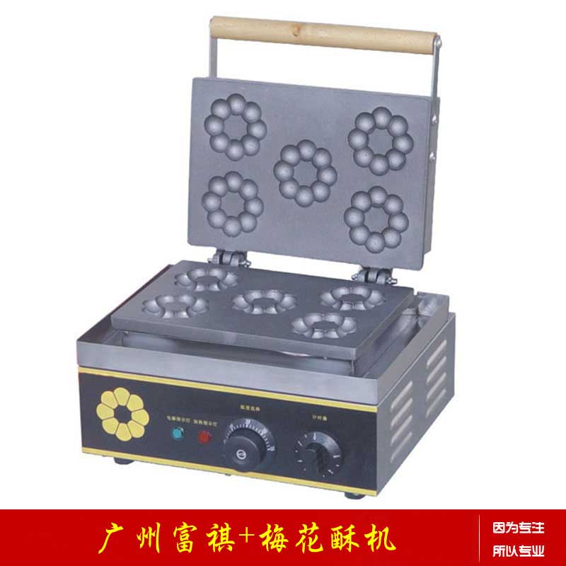 梅花酥机 Plum Crisp Machine 型号(Model):FY-210 产品规格(Packing size):330300300mm 包装规格(Dimensions):410385x320mm 电压(Volts):220V 功率(Power):1.5KW 净重(N/W):9kg 毛重(G/W):10kg 特性:本产品不锈钢外壳,铸铝模型,具有高导电性,加热快,更节能,自动控温功能,特具不粘涂层特富龙,操作简单。高导电铸铁板热量均匀分布从而能够在3-5分钟内提供出金色香酥的梅花甜甜圈机。可移动滴灌托盘周围底板将收集任何面糊过剩,从而易于清洁。双面加热,受热更均匀,更充分,做出的产品颜色均匀,品质更佳,还有定时提示功能,操作更简单方便。 广州市富祺食品机械有限公司,专业生产销售西厨设备,小吃设备,食品机械,酒店用品,快餐设备等:炸炉、扒炉、保温展示柜、无烟烧烤炉、汉堡包机、腌制机、裹粉台、滤油车、煮面炉、保温汤池、烤鸡炉、制冰机、中心岛、薯条柜、蒸包机、烤箱、6通道计时器、8通道计时器、煲仔炉、万能蒸烤箱、保温餐车、蛋糕展示柜、盘柜、冷柜、巧克力炉、关东煮、华夫炉、雪糕皮机、面火炉、板栗机、班戟炉、爆米花机、章鱼丸炉、鹌鹑蛋烤炉、棉花糖机、热狗机、冰淇淋机、果汁机、多士炉、开水机、豆浆机、沙冰机、奶昔机、封口机、摇摇机、碎冰机、咖啡机、香酥机、梅花酥机、圆圆酥机、蛋仔机、红豆饼机、松饼机、烤玉米机、鱼饼机、等等支持全国货到付款,质量保证。