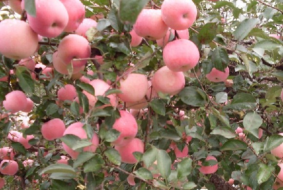 烟台是中国最重要的苹果产地。因为它地处胶东半岛东部,地势高爽气候温和,特别是夏秋季节,空气湿润,太阳光照充足,非常有利于苹果的生长。这些得天独厚的条件,促成烟台苹果色泽鲜艳,口味宜人的特点。其实烟台苹果品种多达一百多个,以青香蕉、红香蕉、红玉、金帅和国光最负盛名。青香蕉、红香蕉和红玉果实硕大,清香浓郁,甜脆可口。前者色呈翠绿,后者浓红如脂,特别是青香蕉,含甜率高达百分之十三点二,香甜如饴,可与南方的香蕉媲美。金帅苹果果实金黄,汁多甘甜,清香爽口,为中秋佳节的应时果品。