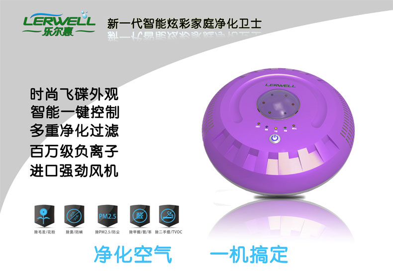 工厂加盟贴牌生产,独立的研发团队,强大的售后服务团队,免去您对产品质量的烦恼和售后的担忧。 产品类别 空气净化器 适用面积 10~20m2 风量 100m3 功能 除甲醛. PM2.5 雾霾 粉尘 烟雾 毛发 净化技术 HEPA高效过滤器 供电方式 交流电 品牌 Lerwell 型号 LAF6001 货号 LAF6001 额定电压 220V 额定功率 12W 额定频率 50Hz 使用环境 室内 属性-负离子浓度 >4000万/cm3 属性-风量 70m3 噪音 55dB 产品规格 "外形尺寸:外形尺寸:直径340mm高度135mm 高效HEPA、HESA双重过滤 负离子,紫外灯,LED炫光灯指示"