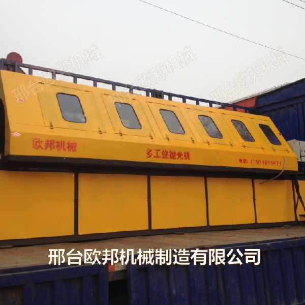 邢台欧邦OB-YY-HB-6圆管自动抛光机. 用途:适用于电镀厂、不锈钢厂等细长轴、批量不锈钢管的抛光。具有使用方便、抛光效益高、自动化程度高等特点。 规格:1、抛光直径:Φ10-500mm;抛光长度:不限 2、外形尺寸:10000×800×1300mm(根据客户要求定做) 性能:1、自动送料系统采用无级调速。 2、抛光部分采用液压系统精密定位。 3、抛光头组:两组、三组、四组、五组、六组、八组。 4、整机功率:两组10kw;三组21.6kw;四组27.1kw;五组32.6kw。 邢台欧邦机械专业生产不锈钢圆管抛光机 多工位圆管抛光机 多工位外圆抛光机 四面方管抛光机 铜管铝管抛光机 不锈钢管镜面抛光机等等抛光研磨设备.