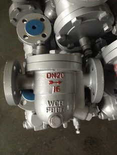 自由浮球式蒸汽疏水阀的结构简单,内部只有一个精细研磨的不锈钢空心浮球,既是浮子又是启闭件,无易损零件,使用寿命很长。装置刚起动时,管道内出现空气和低温冷凝水,手动排空气阀能迅速排除不凝结气体,疏水阀开始进入工作状态,低温冷凝水流进疏水阀,凝结水的液位上升,浮球上升,开启阀门。装置很快提升温度,管道内温度上升到饱和温度之前,自动排空气阀已经关闭;装置进入正常运行状况,凝结水减少,液位下降,浮球随液位升降调节阀孔流量;当凝结水停止进入时,浮球随介质流向逼近阀座,关闭阀门。自由浮球式蒸汽疏水阀的阀座总处于液位以下,形成水封,无蒸汽泄漏。