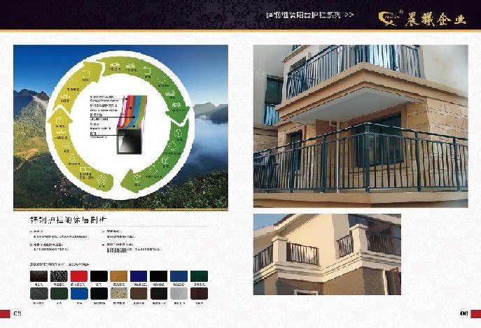 1、阳台护栏—欧式阳台护栏专家 福州晨鑫建筑型材有限公司专业研发、生产、销售阳台护栏、产品采用的国内优质锌钢材料、通过进口涂料及特殊工艺加工而成、可保证20年内不生锈、不脱漆、色彩亮丽。产品不仅经久耐用及可靠的质量保证,产品造型的设计采用欧式、欧典及欧雅艺术的组合、款式及颜色多样化、新颖、整体感觉显得高端大方。 我公司阳台护栏系列产品主要采用组装式冷连结组合结构,组装简单、易操作、即便携式切割机、手电钻即可操作,产品各环节可得到有效防护。 已代替传统产品的操作困难、组装低效率、外观易受损伤等不良缺陷。 阳台护栏主要适用于庭院别墅、办公大楼、地产公司、酒店、商务宾馆及高档住宅等阳台建筑系列,产品上市以来、目前产品用户已上万家,已获得广大用户的喜爱。 10年的研发及生产经验不仅铸就了高端的品质与优质的服务,我们公司一直秉承“以质量求生存、以改革谋发展”的经营经理,坚持以客户满意为核心,为客户提供高质量的产品与优势服务。 我投资、您赚钱、晨鑫公司诚邀您加盟代理,公司免费提供地区代理授权,晨鑫对您的无限支持将创造您人生的辉煌,无限发展的空间成就你腾飞的梦想,我们相信,与晨鑫公司的合作将是您最好的选择。 2、阳台护栏 楼梯护栏 围墙护栏 河道护栏 道路隔离护栏 福州晨鑫建筑型材有限公司专业研发、生产、销售阳台护栏、楼梯护栏、围墙护栏,河道护栏、交通护栏、产品采用的国内优质锌钢材料、通过进口涂料及特殊工艺加工而成、可保证20年内不生锈、不脱漆。 产品不仅经久耐用及可靠的质量保证,产品造型的设计采用欧式、欧典及欧雅艺术的组合、款式及颜色多样化、新颖、整体感觉显得高端大方。 我公司护栏系列产品主要采用组装式冷连结组装式结构、组装简单、易操作、即便携式切割机、手电钻即可操作、产品各环节可得到有效防护。 已代替传统产品的操作困难、组装低效率、外观易受损伤等不良缺陷。 10年的研发及生产经验不仅铸就了高端的品质与优质的服务,我们公司一直秉承“以质量求生存、以改革谋发展”的经营经理,坚持以客户满意为核心,为客户提供高质量的产品与优势服务。 我投资、您赚钱、晨鑫公司诚邀您加盟代理,公司免费提供地区代理授权,晨鑫对您的无限支持将创造您人生的辉煌,无限发展的空间成就你腾飞的梦想,我们相信,与晨鑫公司的合作将是您最好的选择。 3、 阳台护栏 铁艺大门 福州晨鑫建筑型材有限公司专业研、生产、销售产阳台护栏、道路隔离栏、栅栏、围栏、楼梯护栏、铁艺大门,产品采用的国内优质锌钢材料、通过进口涂料及特殊工艺加工而成、可保证20年内不生锈、不脱漆。 产品不仅经久耐用及可靠的质量保证,同时公司已具备一流的优质服务,产品造型的设计采用欧式、欧典及欧雅艺术的组合、款式及颜色多样化、新颖、整体感觉显得高端大方。 我公司栏杆系列产品采用组装式冷连结组装式结构、组装简单、易操作、即便携式切割机、手电钻即可操作、产品各环节可得到有效防护。 已代替传统产品的操作困难、组装低效率、外观易受损伤等不良缺陷。 栏杆系列产品主要适用于庭院别墅、办公大楼、地产公司、酒店、商务宾馆及高档住宅、工厂企业、交通道路、河道等用途,产品上市以来、目前产品用户已上万家,已获得广大用户的喜爱。 铁艺大门要适用于庭院别墅,高档住宅等,我公司一直秉承“以质量求生存、以改革谋发展”的经营经理,坚持以客户满意为核心,为客户提供高质量的产品与优质服务。 我投资、您赚钱、晨鑫公司诚邀您加盟代理,公司免费提供地区代理授权,晨鑫对您的无限支持将创造您人生的辉煌,无限发展的空间成就你腾飞的梦想,我们相信,与晨鑫公司的合作将是您最好的选择。