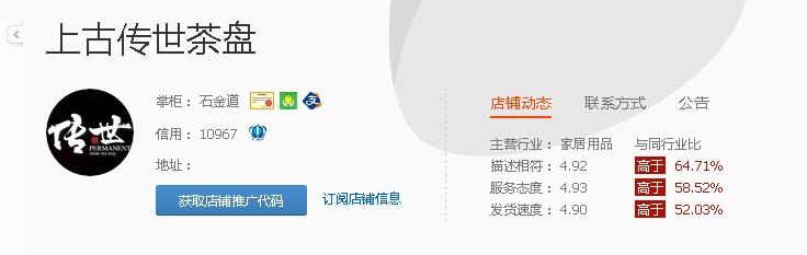 店铺名称:上古传世 店铺属性:集市店 主营业务:家居用品 店铺地址:http://sgcj001.taobao.com/ 推广地址: http://pub.alimama.com/myunio.htm?spm=a219t.7473494.1998155389.3.tgj3AE#!/promo/self/shop_detail?userNumberId=1718324297 佣金比率:5%-15%(单笔佣金最高可得327元) 联系方式:QQ 1543018382 验证信息(淘客) 加入条件:1、淘宝客无条件限制,只要你敢于挑战,高佣金等着你! ????????2、提供您的旺旺ID或QQ以及淘客等级,个人网站IP、PV 首次加入上古茶盘推广的淘客,请加入通用计划, 新品计划成功推广15笔即可升级VIP计划。