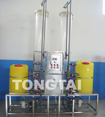 阴阳离子交换树脂可被分别包装在不同的离子交换床中,分成所谓的阴离子交换床和阳离子交换床。也可以将阳离子交换树脂与阴离子交换树脂混在一起,置于同一个离子交换床中。不论是那一种形式,当树脂与水中带电荷的杂质交换完树脂上的氢离子及(或)氢氧根离子,就必须进行“再生”。再生的程序恰与纯化的程序相反,利用氢离子及氢氧根离子进行再生,交换附着在离子交换树脂上的杂质。