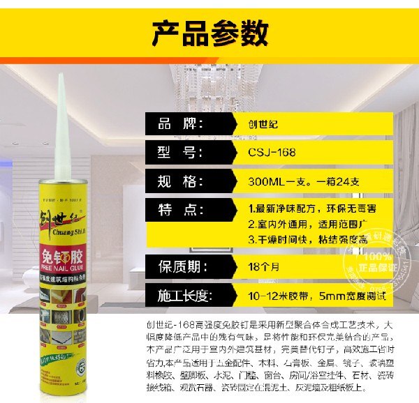 石膏板免钉胶|怎样才能买到有品质的超强万能免钉胶 智研通科技精益求精、捍卫品质,让超强万能免钉胶绽放金华,公司产品会在一周进行发货,客户可以银行转账的方式进行付款,有何疑问可以拨打0755-23764541进行咨询。 智研通科技的产品主要以实体店销售等的方式销往全国。该公司生产的超强万能免钉胶属于高级产品。规格为300ml,形状呈膏状,是目前较受建筑各类工程和家装企业欢迎的一款产品。 让我们一起看看,金属免钉胶,内销免钉胶 强力胶,供应镜子踢脚线密封的信息吧 优惠的免钉胶 强力胶,供应CSJ-168免钉胶 我们用数据说话。 功能:密封粘接 超强万能免钉胶品牌:创世纪 生产厂家:深圳市智研通科技有限公司 生产地址:广东省深圳市龙华新区龙观路华通 售后维修地区:全国 运费:买家承担 售后服务:对使用等方面进行技术指导 物流方式:陆运 产品别名:液体钉免钉胶 抗压强度:pass 适用设备:胶枪 维修地址:广东省深圳市宝安区龙华新区龙观路 适用行业:建筑和家装 价格:10元(人民币)/只 我公司致力于对超强万能免钉胶的生产,超强万能免钉胶在建材装潢领域成为人们首选的产品,尤其是在全国更是引起了一阵销售热潮。智研通科技的产品已被广泛熟知。 智研通科技的超强万能免钉胶畅销全国,主要用于密封粘接,是建筑装潢首选产品,以全国为主要服务地区,客户遍布全国,此外公司产品还囊括各种类型的胶黏剂,满足了广大建筑各类工程和家装企业的需求。 想了解有关供应创世纪免钉胶,信誉好的瓷砖胶,具有价值的瓷砖胶,优质的超强万能免钉胶 液体钉/替代钉子胶水,市辖区强力液体钉zyt8861.1688.com的更多信息可以访问深圳市智研通科技有限公司网站