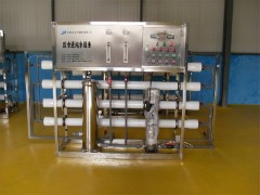 反渗透设备是将原水经过多介质过滤器、活性炭过滤器、阻垢剂加药装置、精密过滤器,再通过泵加压,利用孔径为1/10000μm(相当于大肠杆菌大小的1/6000,病毒的1/300)的反渗透膜(RO膜),使较高浓度的水变为低浓度水,同时将工业污染物、重金属、细菌、病毒等大量混入水中的杂质全部隔离,从而达到饮用规定的理化指标及卫生标准,产出至清至纯的水,是人体及时补充优质水份的好的选择.由于RO反渗透技术生产的水纯净度是目前人类掌握的一切制水技术中高的,洁净度几乎达到100%,所以人们称这种产水机器为反渗透纯净水机。