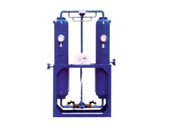 吸干机详细介绍:利用变压吸附,再生循环,使压缩空气交替流经A、B两个充满吸附剂的干燥罐,即一个罐体在高分压(工作压力)状态下吸附水蒸汽时,另一个罐体在低分压(接近大气压)下解析,然后按设定的时间程序切换。 吸附 湿空气从下管系经A1阀进入A干燥罐,自下向上流过吸附剂床,干燥后的空气从上管系排出。 再生 部分干燥空气(约10%)通过上管系再生气调节阀进入B干燥罐。减压后的干燥空气(称为再生气)自上向下对B干燥罐内的吸附剂解析再生,恢复吸附剂的干燥能力,再生气通过下管系B2阀和消音器排放到大气中。 均压 吸附剂再生结束后,B2阀关闭,B干燥罐升压至在线工作压力,准备切换。 切换 下管系B1阀打开,A1阀关闭,A2阀打开,A,B两个干燥罐体完成切换,B罐进入吸附,A罐卸压再生。工作顺序及工作时间由控制器自动控制完成 欢迎来电索取详细资料