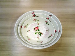 一.预热程序:用原料盒按所需生产的餐具克重称料,称好放进高调波均匀预热,让粉状的原料加热成块状。二.素面程序:将预热好结块的原料倒进模具,启动机械素面程序,经过高温高压、固化成型。三.贴花程序:将刷好罩光粉的花纸按花形剪好,按要求贴在素面成型的餐具上,花纸要贴正,贴花方位适中,让人看的美观大方,贴好花启动机械印花程序。四.加金程序:产品贴好花后,在产品表面均匀撒上光粉,光粉不能撒少,否则影响产品的色泽度,当然也不可撒多。然后启动机器,在经机械的高温高压、固化,产品表面有瓷器一般的亮泽。五.抛光程序:产品生产出来后还要进行打磨、抛光,因为生产出来的产品有毛边,不利于人们生活的使用,容易对人的手和嘴造成伤害;所以打磨、抛光必不可少,通过打磨、抛光可以把产品的毛边去掉,使产品看起来更加美观,边口更加光滑。六.检验、包装程序:抛光作业,就进入了检验环节,严把质检关,应设有初检和复检,挑出不合格产品,然后进库包装。