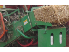 9YFB-3045D型喂入背负式方捆秸秆打捆机主要由箱体、进料口、秸秆喂入滚筒、主活塞、副活塞、压缩室、打结器、穿针、绳捆等部分组成。箱体采用耐磨锰板焊接而成,结构紧凑,体积小,节约成本、外观美观;压捆室采用活塞推进,压缩比小,效率高;打结器是打捆机的核心部件,其可靠性决定了打捆机的经济效益。我公司生产的打捆机采用德国进口打结器,采用耐磨铸铁件,加工成本低、质量轻,可有效增加打结器的耐用性。草捆密度是打捆机最重要的技术参数之一,在草捆密度符合国家标准的基础上,高强度压缩室提高了草捆密度,可以有效的节约存储空间和运输成本。秸秆输送到压捆室进行一次打捆,草捆密度相对较低,且草捆较为松散。所以,本机特地设置了副活塞,在秸秆进入成捆室之前进行一次预压紧,不仅可以增加草捆的紧实度,有效防止因草捆松散而造成的散捆现象,还能提高秸秆的成捆率。秸秆喂入装置是打捆机的一个重要组成部分。由于配套打捆机没有捡拾机构,秸秆的喂入仅仅依靠联合收割机上风机的力量是远远不够的,如果不设置喂入机构就会导致大量秸秆在打捆机入料口处堆积,造成堵塞,影响秸秆进入成捆室,阻碍活塞的正常往复运动。将喂入机构设置在联合收割机出草口和打捆机入料口连接处,其作用是在活塞运动至入料口后下方时将秸秆压入到入料口中,协助活塞将这部分秸秆送入成捆室;当活塞离开入料口时,挡住联合收割机喷出的秸秆,避免在活塞后方存有秸秆,影响其运动。