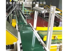 该机为皮带输送机,和倒袋机组合一起实现将立姿料袋自动放倒。自动感应系统检测到有包装袋到位后,把倒袋信号传送给倒袋机,使倒袋机自动实行倒袋工作。