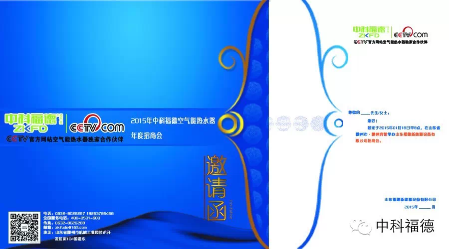 “新能源,新梦想”2015中科福德空气能首场“亿级财富与您相约”大型招商会将于元月18日在山东滕州盛大启幕。届时会有来自全国各地的新老顾客莅临参加中科福德空气能合伙人招募大会,通过此次会议能够让更多的消费者与行业爱好者全面认识了解中科福德空气能。中科福德空气能真诚与您相约山东滕州,共同探究空气能的发展,携手共赢亿万级财富。 |