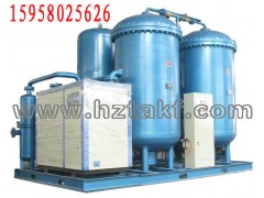 装有专用分子筛的吸附塔共有A、B两只。当洁净的压缩空气进入A塔入口端经分子筛向出口端流动时,N2被其吸附,产品氧气由吸附塔出口端流出。经一段时间后,A塔内的分子筛吸附饱和。这时,A塔自动停止吸附,压缩空气流入B塔进行吸氮产氧,对并A塔分子筛进行再生。分子筛的再生是通过将吸附塔迅速下降至常压脱除已吸附的N2来实现的。两塔交替进行吸附和再生,完成氧氮分离,连续输出氧气。上述过程均由可编程序控制器(PLC)来控制。当出气端氧气纯度大小设定值时,PLC程序作用,自动放空阀门打开,将不合格氧气自动放空,确保不合格氧气不流向用气点。气体放空时利用消音器消声使噪声小于75dBA。