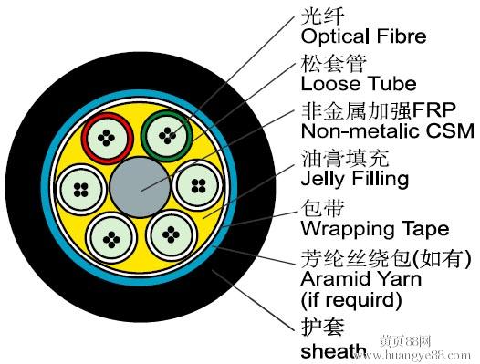 GYFTY 光缆的结构是将单模或多模光纤套入由高模量的聚酯材料做成的松套管中,松套管内填充防水化合物。缆芯的中心是一根非金属加强芯(FRP),对于某些芯数的光缆来说,非金属加强芯外还需挤上一层聚乙烯(PE)。松套管(和填充绳)围绕中心加强芯绞合成紧凑的圆形缆芯,缆芯内的缝隙充以阻水填充物,缆芯外挤上一层聚乙烯护套成缆。