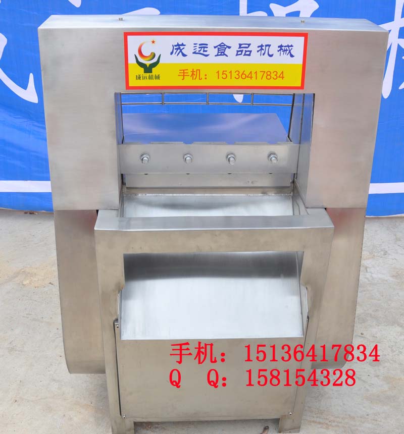 河南冻肉切片机厂家 冻肉切片机价格报价 冻肉切片机,也叫冻肉分割机,可将冻肉在不解冻的前提下(50斤/盘)直接上机切成任意厚度的段或薄片,供绞肉机、斩拌机加工使用。本机外壳采用喷塑和不锈钢制造,切刀用特殊钢制成,耐磨,耐用。外形美观,结构简单,维修方便,速度快、效率高、价格低、省时省力等特点。河南冻肉切片机厂家 冻肉切片机价格报价 替代了人工坎肉、大大降低了劳动强度,是肉食品加工企业不可缺少的设备。并能将脊骨、肉排斩断,一机多用,更是您的理想选择。料道宽度:490mm 横刀行程:280mm 功率:3kw 外形尺寸:900*870*1300 手机:15136417834 QQ:158154328 赵先生 网址 www.xyjx518.com