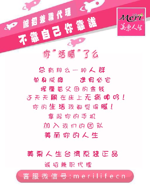 不想输,就别懒,不逼自己一把永远不知道自己有多优秀,机会来了0元成本0元押金,美栗人生做你坚强的后盾,再不拼就过了可以拼的时代。 美栗人生-成立于1995年,为一家以农业特产研发、代工、制造批发为主的事业机构。 美栗人生发源自台湾苗栗,草创初期仅为销售弄特产及其附属加工产品,经过二十年努力发展至今拥有研发、代工制造及大量批发能力的中大型企业,业务遍及东南亚及欧美,销售据点突破五百个,产品种类接近百种, 美栗人生在农产品的推广、有机产业及农业生化科技上的突破与深耕,本着对自然环境关怀与热爱:结合人文和绿色产业,以 客家人农本自然的精神强调养生、环保、健康的新主张,亦即企图在自然环境,人文生活上,开发一系列有利于人的事业。 美栗人生有一个强烈的目标:是使其成为一个有国际性、有信用的、具知名度的、企业组织;美栗人生尊重人才-人文及其培训划; 善用科技及文化、知识的创造价值;并且利用其方法反映到我们的经营利益上。同时为了要达到以此长期经营的目的,我们必须同时专注于财务和企业伦理的表现,遵守当地的法律行为方式来执行合理、利民的商业活动。 美栗人生支持任何诚信、信用、及忠贞的组织成员,对于所产生的资源、价值与利益,共同的分享与负责,我们的企业最高指导原则即为诚信及商誉:美栗人生坚持客户满意度,坚持守法,强调工作的效率跟品质,以回馈美栗人生客户的长期利益 联系微信:meriLifecn 联系QQ:195680000 官方认证微信公众号:美栗人生 官方认证微信公众号:meriLife-cn 相册网址:http://merilife.v.yupoo.com 阿里网址:http://mlrs1995.1688.com 官方网址: http://www.merilifecn.com