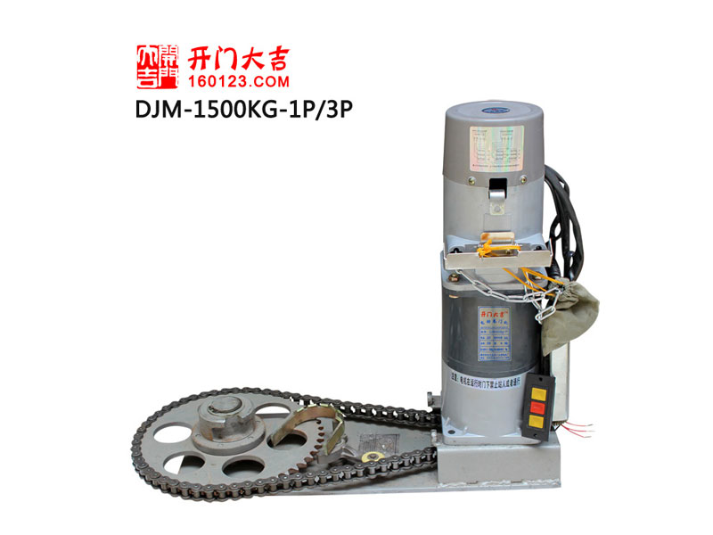 开门大吉卷帘门电机 DJM-1500kg-1P/3P 漳州市龙文区开门大吉电机厂DJM系列电动卷门机具有遥控、电动、手动等多种操作功能;适用防火配套要求,具有自锁及防盗作用;造型美观,安全可靠,使用寿命长,安装维修方便,体积小,重量轻,马力强劲等优点,它被广泛应用于展览馆、宾馆、商场、店辅、厂房、车库、仓库,是普通卷门和防火卷门的理想配套产品 工作环境和工作条件: 1、环境空气温度随季节变化。 2、相对湿度为90%(25℃)。 3、短时间工作制,连续运转不得超过5分钟。 安装与调试: 1、统一按右安装方法制造(从屋内向门外看),若左安装需将制动壳体四个锁紧螺钉放松,即旋转手拉链的壳体180°后重新锁紧,按钮开关线白(上)绿(下)色需对调。 2、链轮支架板可按具体需要水平安装或在0~45°C范围内旋转安装固定。当链轮支架板不为水平安装时,应旋转制动壳体使环手拉链条自然垂直向下,同时特别注意壳体与电机端盖结合处的配合,确定没有间隙后,将四个螺钉(对角均匀)拧紧,避免因拧力过大使壳体裂纹,影响制动刹车效果。 ①卷帘(门)机应水平安装,门帘卷轴应同心、水平,帘片无滞卡现象。 ②调节链条下垂度为3-6mm(在转轴未挂门帘前调整)。 ③严禁提拎电机引线套管。 ④卷帘(门)机供电外接电源截面不小于1.0mm2。 ⑤特别注意防潮湿、雨淋,避免电动卷帘(门)机电器短路,导致卷帘(门)电机烧坏。 ⑥请按规定接好底线。