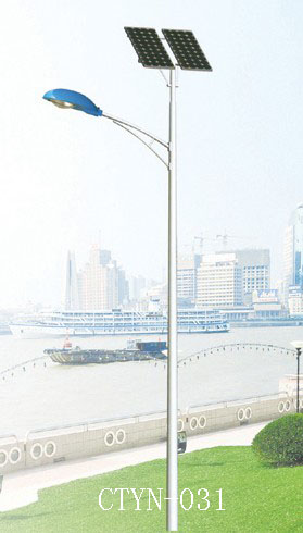 系统由太阳能电池组件部分(包括支架)、LED灯头、控制箱 (内有控制器、蓄电池)和灯杆几部分构成;太阳能电池板光效达到127Wp/m2,效率较高,对系统的抗风设计非常有利;灯头部分以1W-5W白光LED和1W-5W黄光LED集成于印刷电路板上排列为一定间距的点阵作为平面发光源。
