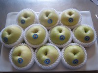 黄金梨:果实近圆形,果形病正,果肩平,果形指数0.9,不套袋果果皮黄绿色,贮藏后变为金黄色;套袋果,果皮黄白,果点小,均匀,外观极其漂亮;果肉乳白色,果核小,可食率95%以上,肉质脆嫩,果波动多而甜,有清香气味,无石细胞。含可溶性固形物12%-15%,平均单果重350克左右,大果500克以上。