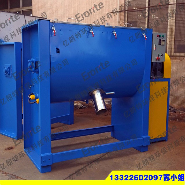 卧式搅拌机传动主轴上布置了双层螺旋叶片,外部叶片将物料向中间输送,内部叶片将物料向外侧输送。物料在双层螺旋带的对流运动下,形成了一个低动力高效的混合环境。由安装在搅拌轴上的内外径螺旋带动桶体内物料,使搅拌器在桶体内对物料进行大范围的翻动过程。搅拌装置在工作时,内螺旋带动靠近轴心处物料做轴心旋转,轴向由内至两侧推动,外螺旋带动靠近桶壁物料做轴心旋转,轴向由两侧至内推动,本混合物料能够在较短时间内均匀混合。