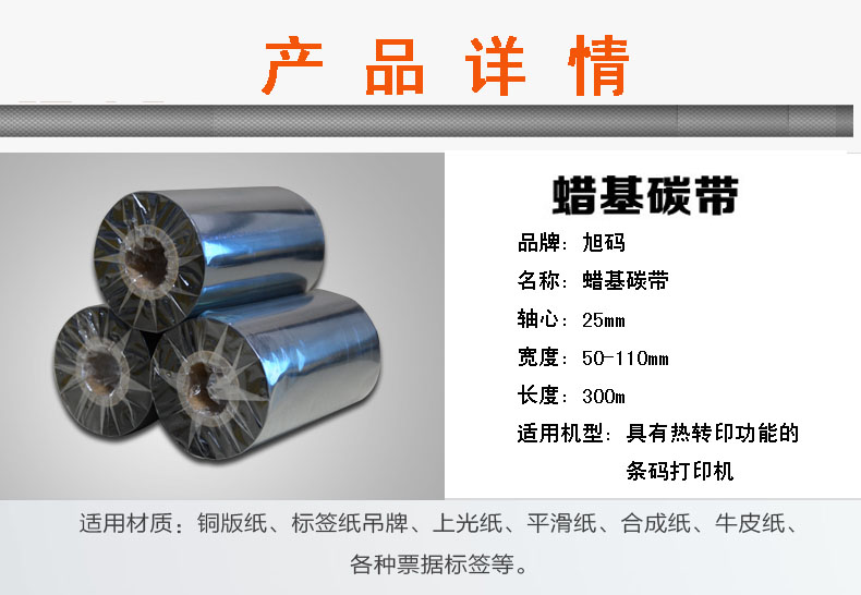 济南旭码信息技术有限公司专业供应条码打印机用碳带,规格:(50-110)*300m均有库存也可根据您的需要专门定做分切,材质:蜡基、混合基、树脂基多种。
