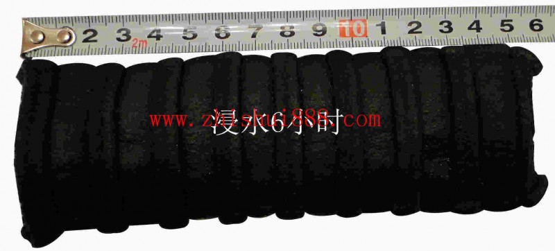 迄今为止隔水通常采用以浆土,水泥投入钻口至一定深度,或在橡胶中充空气或水,然而这些隔水法的隔水可靠性低,作业要求高,在山区施工又必须备大量器械设备及材料等,所以施工困难,其困难的程度随隔水深度不可能逾越200m,300m。与此相反,如用密封带缠绕在插入到钻孔的物体上,缠至一定厚度,并用胶带粘接防止滑移后即可用于有地下水的深度隔水,不必经过任何作业,便可阻止井水的流动。其优点是不需用机械工具,便能在要求的深度有效的隔水,隔水深度不限。能简单有效?廉价?地进行钻孔内的隔水吸水膨胀后的密封带是变形量大的弹性体,其性质和膨胀时产生的压力,以及其凹凸的特殊形状,能与钻孔壁的凹凸面良好地吻合,充分的充填间隙,发挥隔水效果。另外本密封带且具有抗剪力小的特点,并能回收,十分经济。