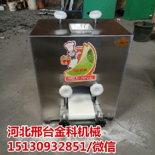 金科全自动小型饺子皮机、馄饨皮机是几组对辊连续辊压,一次成型原理设计制造的,它有电机,减速机装置,传动装置,两组供料粗压辊,一组合片轧实轧辊,一组轧实辊,一组轧光辊组成。