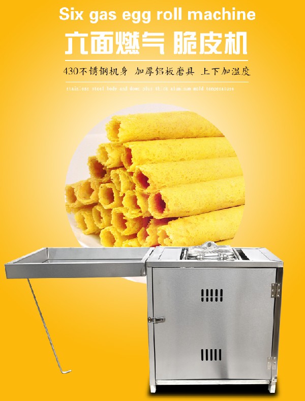 金科机械专业的六面燃气蛋卷机 出售优质的六面燃气蛋卷机该机一人即可操作,用到的人偏少,节省成本!该机简单易学,男女老少都可以使用这款机器,不用担心自己不会操作机器怎么办!该机所出的产品,金黄酥脆,老少皆宜,深受到大家的喜爱啊!所以做这个生意肯定是非常不错的!六面燃气蛋卷机该机工作效率高,制造成本低!燃气蛋卷机价格合理!可以在短时间内,制作出很多蛋卷,一般的零售,是完全可以达到的!具有省时省力节约能源的功能。小型家用蛋卷机该机整机不锈钢材质制作,机器外观非常豪华与市面上的小型燃气蛋卷机普通喷漆的档次是完全不同的。我司的机器做工特别的惊喜,质量非常的不错!该机有适合家庭小型使用的,有适合一般做生意使用的。欢迎您的来电咨询!本机采用上面加热方式,六面燃气蛋卷机是目前国内市场制作优质蛋卷的理想设备。机器采用加厚钢板制作,小型家用蛋卷机上下为加厚钛镁合金模板(克服了铝制机器不耐高温,燃气蛋卷机价格合理!易损坏的弱点)蛋卷受热均匀,色泽鲜艳。安在制作过程中,升温、降温、 控制温度更加准确,安全性能好,小型燃气蛋卷机耐高温,可保障持续制作产品,使用效率高!燃气的设备,是6面的,一次可以制作6张蛋卷,电的设备,一次可以制作1张蛋卷。燃气的是旋转工作的。机器内部有2个灶头,加热更加的快!机器在制作过程中,不会粘连,保证了制作出来的蛋卷,口感和品质!   购买设备,可以随机提供您制作蛋卷的配方,六面燃气蛋卷机这样您就更简单更容易的可以做出来蛋卷了,燃气蛋卷机价格合理!非常的简单,小型家用蛋卷机配方您根本就不需要担心!这么受欢迎的一种小吃,金科小型燃气蛋卷机您做了,生意肯定会非常好,更多详情可来电咨询我司客服了解!