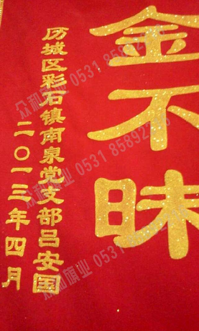 众和旗业成立时间悠久,是印刷耗材市场的排头兵,积累了充足的经验,随着设备的更新换代,我们的产品越来越优质。本公司的镭射粉金字锦旗可通过批发零售;实体店销售;网上销售的形式购买,我们会使用陆运的物流方式为您发送货物。以创新铸就卓越,以品牌缔造辉煌,众和旗业将持续加大投入,不断提高研发设计能力、织造印染技术,为向国内外市场提供优质、时尚的镭射粉金字锦旗而不懈努力。