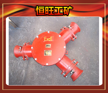 接线盒的隔爆外壳为钢板结构,盖采用螺栓压接形式,两侧为电源引线端,并设有控制线引入装置。壳体内设有三个主接线端子,接线柱上压板将电缆头压接。基座为高压电瓷,并设有一个辅助接线端子。