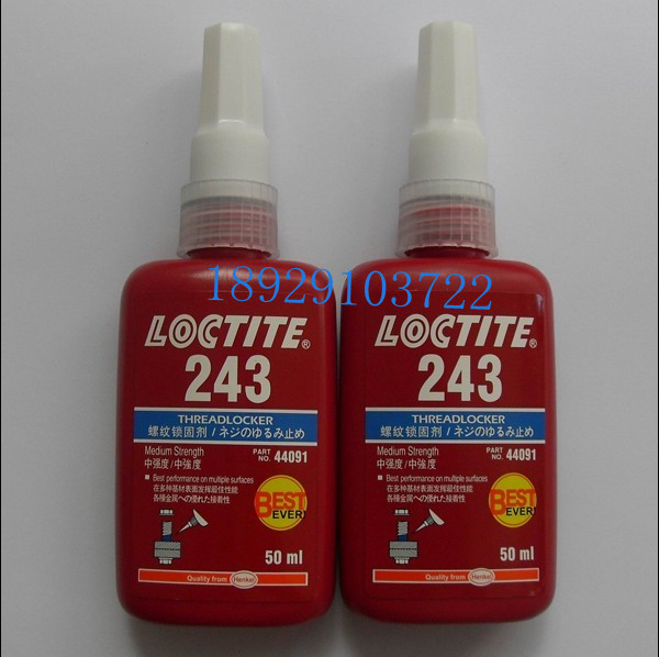 乐泰243胶水-乐泰243螺丝胶-乐泰厌氧胶-螺纹锁固密封胶,咨询热线:189-2910-3722 罗小姐 乐泰发明的螺纹锁固剂是螺纹锁固及密封的一次革命,从精密的零部件到重型的结构设备,乐泰螺纹锁固剂的用途十分广泛,乐泰提供的各种粘度及强度的螺纹锁固剂,适用于任何用途与环境,包括在各种严酷的恶劣的环境条件下的应用。乐泰243螺纹锁固剂、耐机油/中强度。快速固化,可用于惰性表面,容油性好。易拆卸,可在轻微油质的工作表面上使用。用于乐泰预涂剂 Dri-Loc 螺栓拆装后重装时锁固。可以用于 M20 以下螺纹的锁固与密封。典型用途:中强度,容油性好,颜色:蓝色,粘度(mPa.s):1.300/3.000,平均拆卸力矩(N.m):7,平均破坏力矩(N.m):20,温度范围(℃):-54~150固化速度钢@25℃:初固/5分钟 全固/3小时,推荐促进剂:7649/7471。相对密度:1.08,包装规格:50ml瓶装、250ml瓶装。