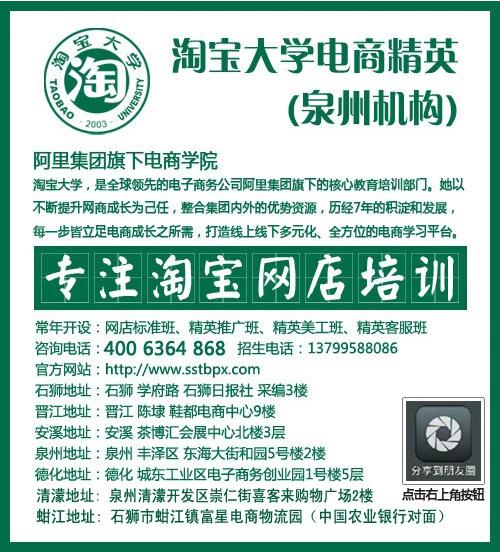 由石狮日报社,阳光职校联合主办的【淘宝大学泉州机构】是淘宝大学福建区域目前唯一的官方授权机构。常年开办精英推广班,精英客服班,精英美工班。