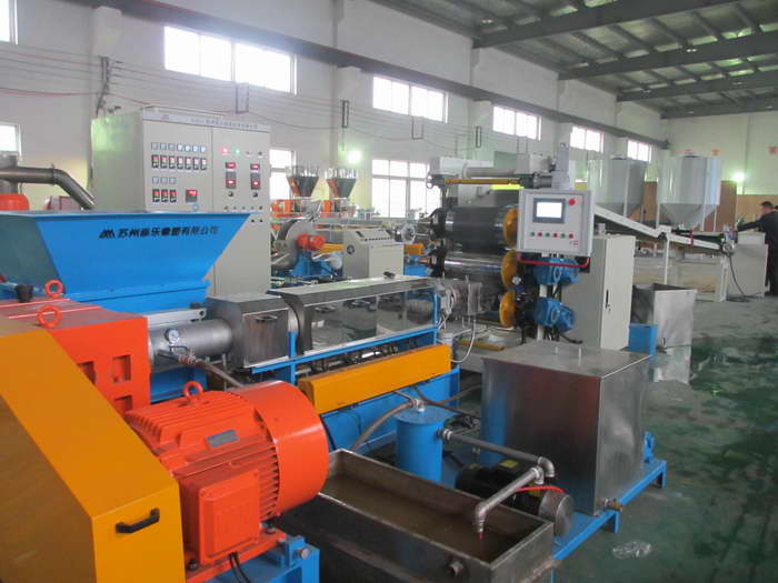 EVA发泡片材挤出机的造粒工艺:密炼机 → 提升机→ 锥双喂料机 → 单螺杆造粒机 →成型模具 →三辊挤压表面处理→电晕处理→牵引机 → 切割机 → 堆放 →成品(18915741197 李清霄0512-36808628-8011)