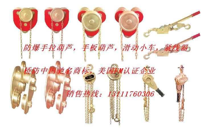 防爆手拉葫芦:本发明以铝青铜、铍青铜作为毛坯,手拉葫芦外壳采用H62铜合金材料。本发明手拉葫芦受力摩擦部位包括构成手拉葫芦的起重轮、手链轮、墙板、挂钩、齿轮、齿轮轴采用铝青铜、铍青铜合金材料。本发明防爆手拉葫芦适用于石油、化工、炼油、采气、油品运输、矿山作业等易燃易爆气体场所。专利号为:200310109687.4,望用户在购买时。