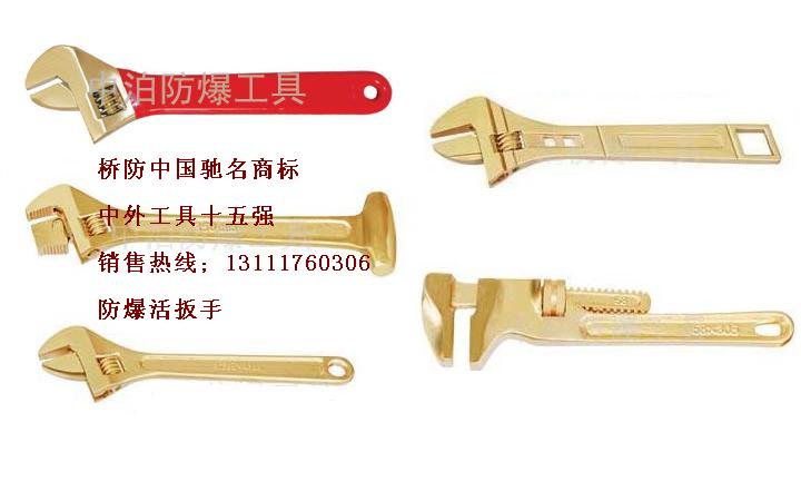 防爆活扳手:是我司生产的扳手的一种,是工业普遍使用的一种产品,防爆活扳手用来紧固件,可以通过调节开口的大小,来调节不同规格的物件。使用方便,简洁,是我司热卖产品。一:工具符合国标GB10686-89标准,防爆性能终身保用;二:铝青铜防爆性能: 三:硬度:HRC 25 以上抗拉强度:75-85 kgf/mm2 四:铍青铜防爆工具在易燃气体(浓度为21%)的氢气环境中作业,不产生火花,不引爆气体,硬度达到HRC35以上,抗拉强度105- 120kgf/mm2,达到国家ExIIC级标准,且具备独特的防磁性能;防爆活扳手分为以下几种规格:4、6、8、10、12、15、18、24(寸)或100、150、200、250、300、375、450、600(mm)可供客户选择。此外,我司对于大批量异型件也考虑加工。