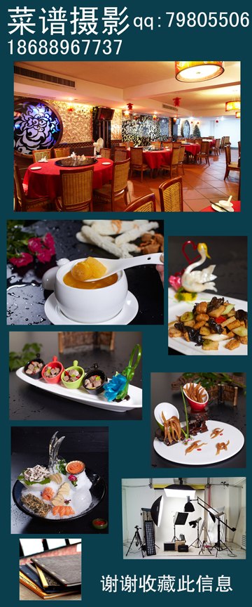 美好菜谱摄影的摄影师团队,巧妙的结合光影效果,为每道菜肴寻找最完美的表现形式。美好菜谱摄影的摄影师团队以高度的审美意识,针对不同的菜系,给予准确的风格定位,站在美食家的高度,仔细观察发现每道菜、每种食品与众不同的诉求点。美好菜谱摄影的摄影师有独具匠心的菜品造型与背景道具设计,使得拍出的菜肴照片高贵而细腻。美好菜谱摄影颠覆传统菜谱食品摄影中把菜肴当作物品以记录的试进行拍摄,而是赋予美食予生命,娇艳的身姿,时尚的妆容,让菜肴摄影符合实现吸引顾客消费的目的。 我们拥有2200万像素的高端摄影设备、专业灯光、专业镜头、以及拥有多年菜肴摄影、菜肴布光经验的菜肴摄影师,拍出的菜肴照片栩栩如生,让每个食客都能从照片上看到菜品的味道,从而实现视觉影响味觉,刺激吸引消费的目的。 tel:13960394988 18688967737 qq:79802796