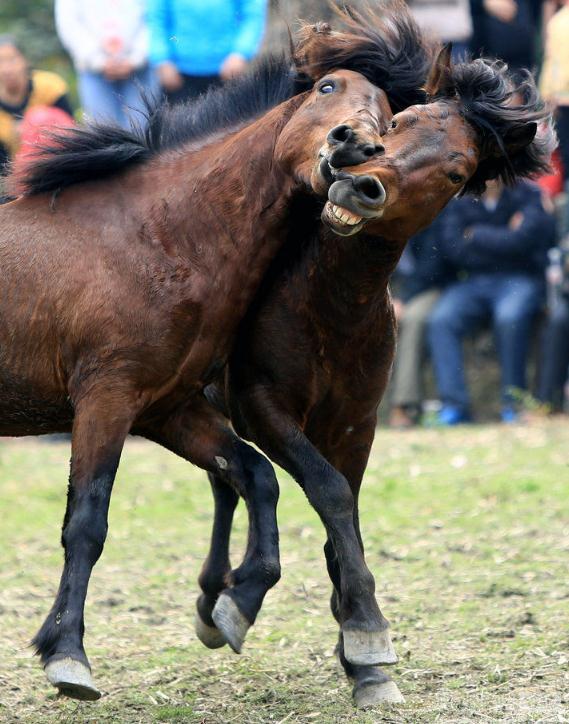 斗马比赛中,两匹马在互相啃咬。