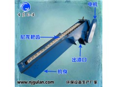 该设备是由ABS 工程塑料、尼龙或不锈钢制成的特殊形耙齿,按一定的排列次序装在耙齿轴上形成封闭式耙齿链,其下部装在进水渠水中。当传动系统带动链轮作匀速定向旋转时,整个耙齿链便自上而下运动,并携带固体杂物从液体中分离出来,流体通过耙齿间隙流出去,整个工作状态连续进行。由于耙齿的特殊结构形状,使耙齿链携带杂物到达上端反向运动时,前后耙间产生相对自清运动,促使杂物依靠重力脱落,设备后面可设置旋转的清污刷,进一步除净滞留在耙齿污物,如需要定货时需注明。