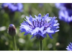 矢车菊,菊科矢车菊属一年生或二年生草本植物,高可达70厘米,直立,分枝,茎枝灰白色,基生叶,顶端排成伞房花序或圆锥花序。总苞椭圆状,盘花,蓝色、白色、红色或紫色,瘦果椭圆形,花果期2-8月。高性种植株挺拔,花梗长,适于作切花,也可作花径材料。矮型株仅高20厘米,可用于花坛、草地镶边或盆花观赏。大片自然丛植。高型品种可以其他草花相称布置花坛及花境。也可片植于路旁或草坪内,株型飘逸,花态优美,非常自然。还可做切花花卉。