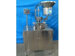 本机是我厂在消化吸收国际制药包装机械先进生产技术的基础上自主研制开发的高速轧盖设备。该机生产能力高、稳定可靠,适用于管制或模制抗生素玻璃瓶复合盖、铝盖的封口,是药厂及科研单位实现自动化作业的理想设备。主要工作原理:本机采用三刀单头式的轧盖形式,该形式具有结构调整简单、维护方便、轧口美观等优点。经过灌装后的西林瓶由输送带平稳的送入压塞机构,震荡器通过料斗和轨道把胶塞送入轮式压塞轮,胶塞通过压塞轮按入瓶口。压塞后再由输送带送入分瓶拨盘,震荡器通过料斗和轨道把复合盖或铝盖送到戴盖工位,进瓶拨盘把瓶子戴盖后送入轧盖工位,由轧盖机构压紧瓶盖再有三个刀头慢慢锁紧铝盖边缘,然后轧盖头松开瓶盖,瓶子由出瓶拨盘拨出,进入出瓶轨道,从而完成整个轧盖工序。由于采用了偏心调整机构,轧盖过程中能很方便的调整轧刀的高低位移,达到理想的轧盖效果。